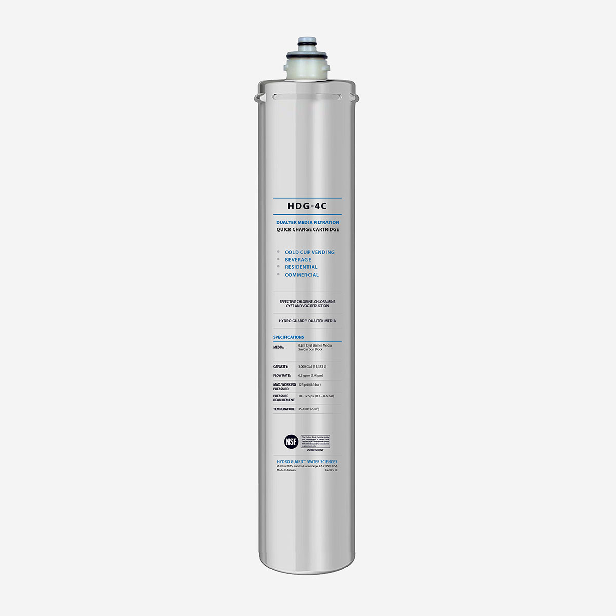 Hydro Guard Water Sciences™ model HDG-4C sanitary filter cartridges utilize DualTek filtration media to effectively address Chlorine, Taste, Odor, Sediment and Cysts in Cold Cup Vending and other Food service applications.
