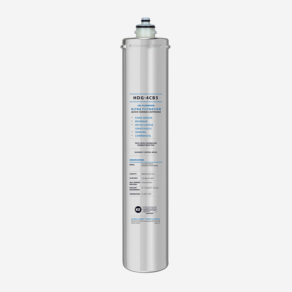Hydro Guard Water Sciences™ model HDG-4CB5 sanitary filter cartridges utilize CB+ filtration technology to effectively address Chlorine, Taste, Odor and Sediment reduction in Food Service, Office Coffee Service (OCS), Beverage, and Vending applications.