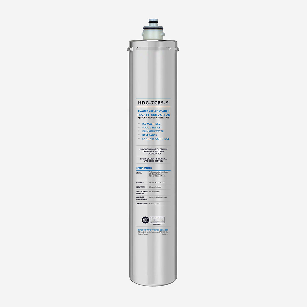 Hydro Guard™ HDG-7CB5-S are simple, quick and clean. The internal filter parts are never exposed to handling or contamination and offer true sanitary filter cartridge benefits for ease of use and optimal performance. The HDG-7CB5-S (also part number HDG-EV9218-21) cartridge reduces scale, chlorine taste and odor and other offensive contaminants that can adversely affect the taste of beverages. The TriTek filtration media for enhanced performance provides superior chlorine taste and odor reduction.